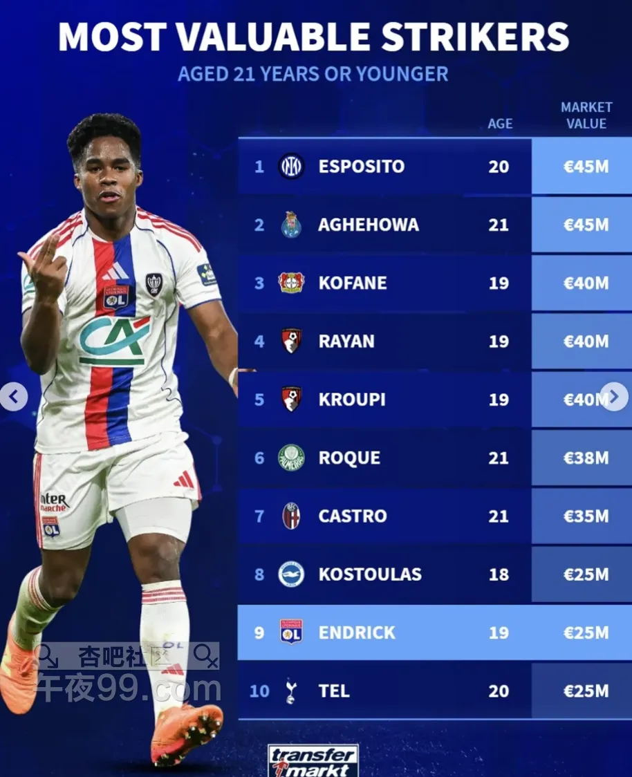 [|足球快报] 足坛U21中锋身价榜:埃斯波西托和奥莫罗迪翁4500万并列第一 |